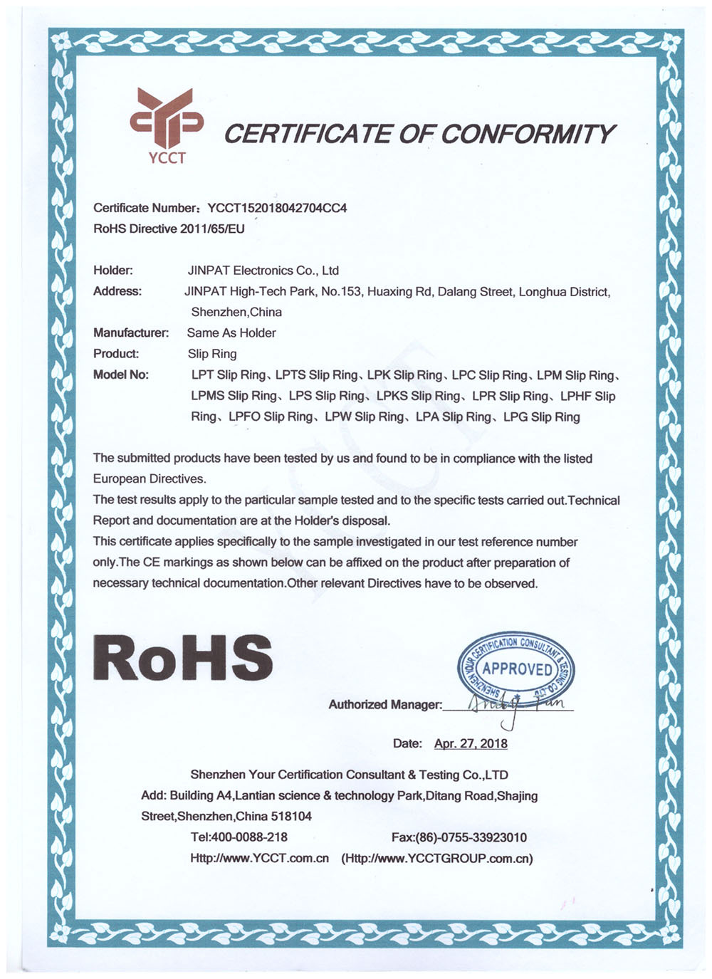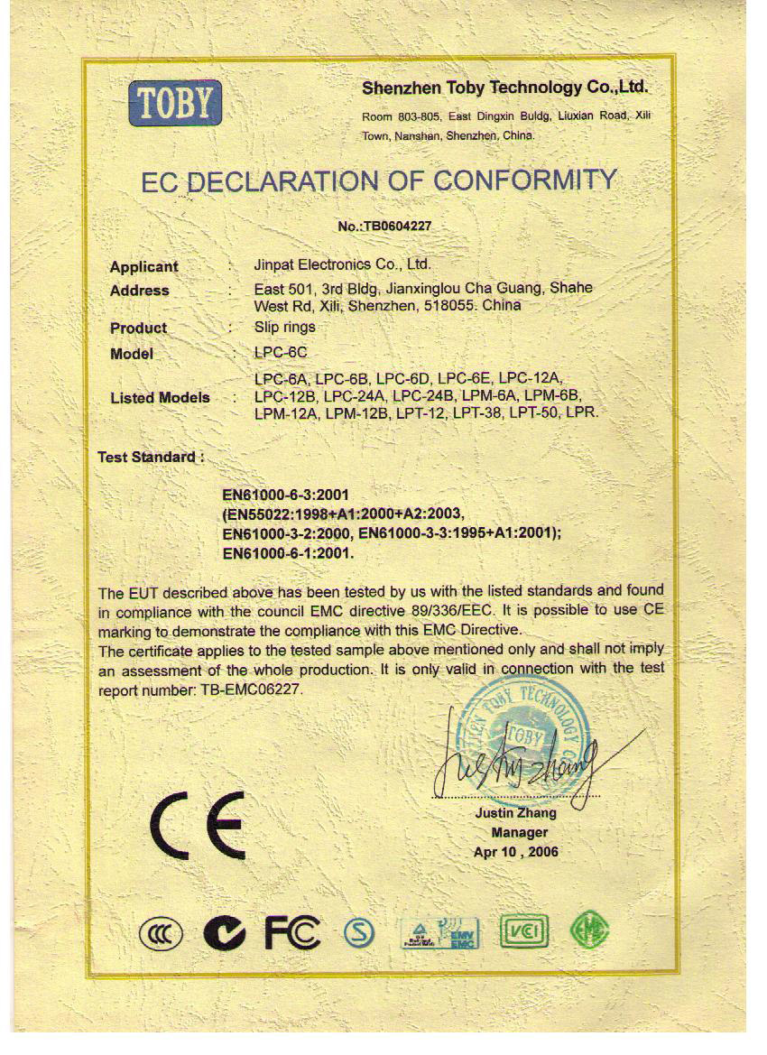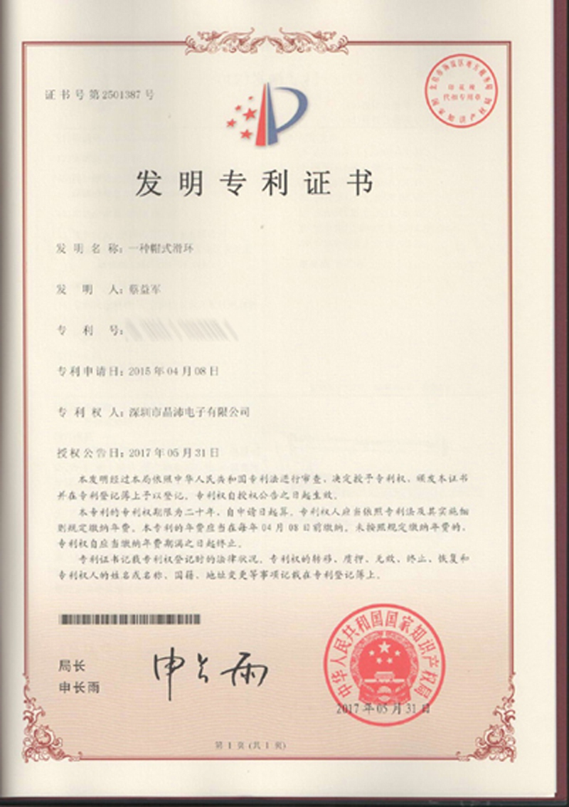 晶沛通過(guò)了歐盟CE認(rèn)證火烧眉毛、FCC認(rèn)證振奋人心、SGS認(rèn)證一直以来,一脸堆笑、BV“船級(jí)社”認(rèn)證、防爆認(rèn)證等多項(xiàng)認(rèn)證,生產(chǎn)的導(dǎo)電滑環(huán)都符合RoHS環(huán)保要求,先后被授予“國(guó)家高新技術(shù)企業(yè)”稱(chēng)號(hào),目前已獲得45項(xiàng)專(zhuān)利,其中發(fā)明專(zhuān)利6項(xiàng)。